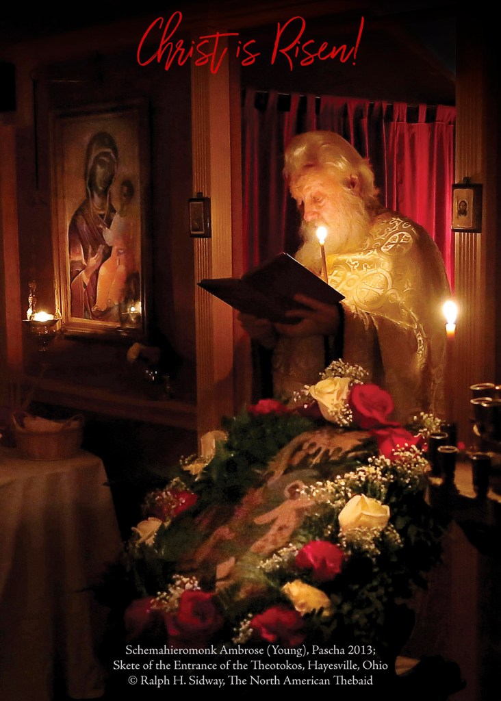 For those of you familiar with The North American Thebaid book, you will recognize this photograph of Fr. Ambrose (Young) which accompanies his wonderful essay, “What is a Holy Pilgrimage?” The text is a selection from the remarkable Paschal Homily of St John Chrysostom, read to the faithful every year at the conclusion of the Paschal Matins.
