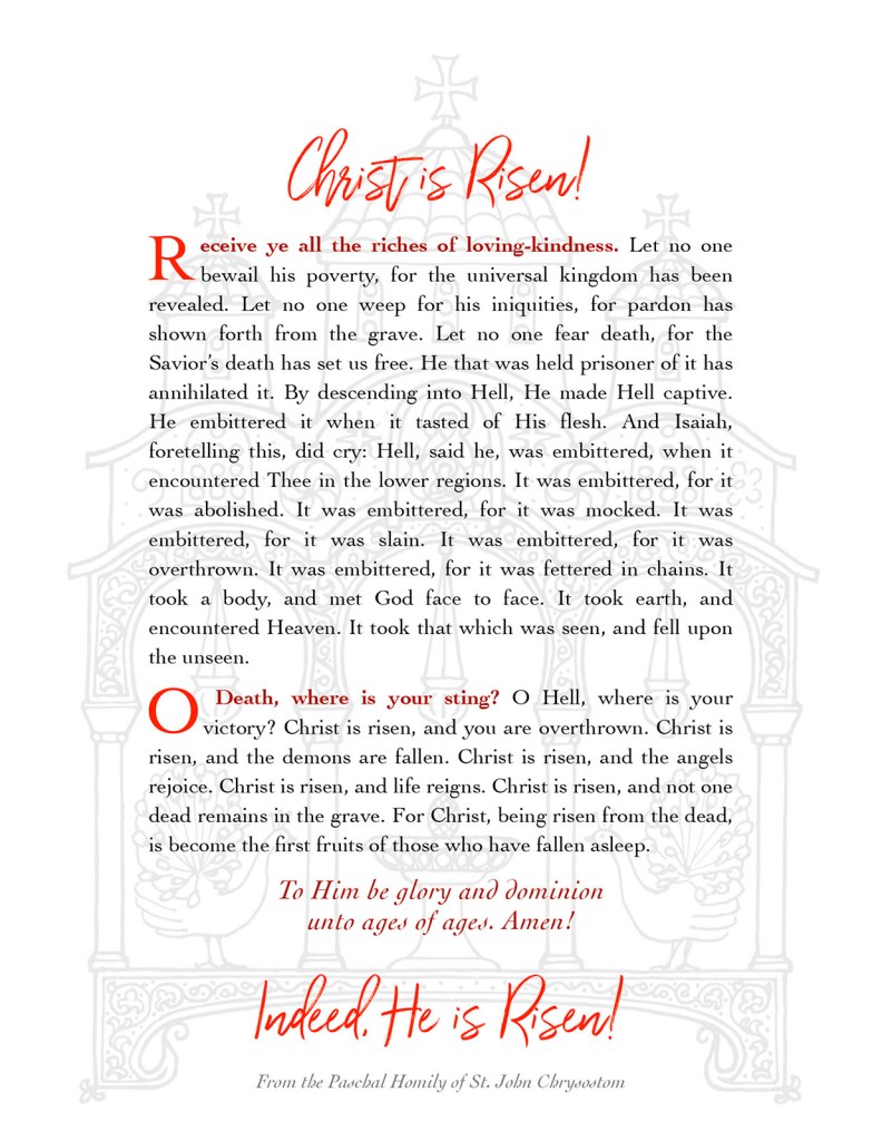 Sorry I haven’t been too active here lately. Some news to report soon, but for now, I wanted to greet you on the Feast of Feasts, of Christ’s Resurrection, with a special Pascha card I designed this year.